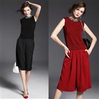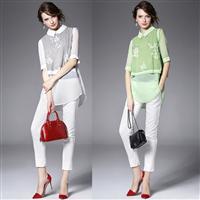 2015夏季新款 v领钉珠绣花拼贴修身短上衣+波浪纹阔腿短裤套装女