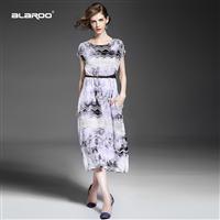 2015夏季新款 气质圆领包肩袖水墨印花镂空拼接收腰大摆连衣长裙