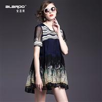 2015夏季新款 圆领短袖印花拼接大摆桑蚕丝连衣裙子