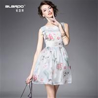 2015欧美女装夏季新款 圆领无袖真丝蓬蓬连衣裙裙印花修身a字裙