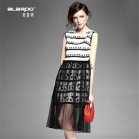 2015夏季新款女装 网纱印花套头束腰修身中长连衣裙送吊带