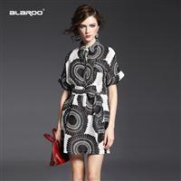 2015夏季高端女装 欧美大牌翻领蝙蝠袖太阳花系带真丝麻连衣裙子