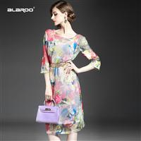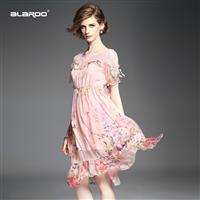 2015夏季女装气质淑女蕾丝拼接荷叶边真丝印花弹力收腰中长连衣裙