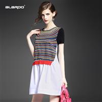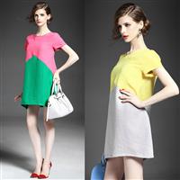2015夏季新款 时尚圆领短袖棉麻撞色拼接宽松娃娃裙