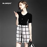 2015夏季品牌女装新款 圆领单排扣弹力针织拼接格纹真丝连衣裙
