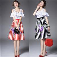 2015欧洲站夏装新款 气质方领荷叶边条纹拼接印花修身中长连衣裙
