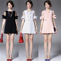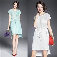 2015夏季新款 优雅纯色圆领钉珠收腰系带不规则连衣裙