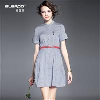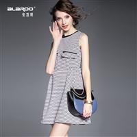 2015夏季女装欧美圆领格纹修身大摆A字裙连衣裙收腰显瘦送腰带