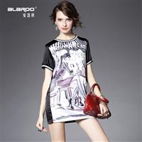 2015品牌女装夏季新款 欧美大牌圆领短袖印花拼贴真丝修身一步裙