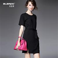 2015夏季女装 圆领短袖条纹收腰系带修身一步裙品牌连衣裙