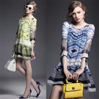 2015夏 欧美圆领七分袖蕾丝拼接真丝印花压褶修身a字裙送打底吊带