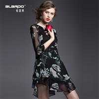 2015夏季新款 欧美时尚圆领包肩袖印花开叉压褶大摆连衣裙中长裙