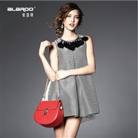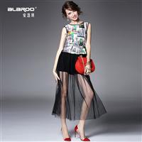 2015夏季女装新款 圆领无袖荷叶边网纱拼接收腰修身长裙