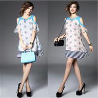 2015夏季女装欧美时尚露肩圆领重工绣花小碎花条纹拼接宽松娃娃裙