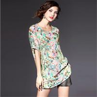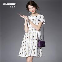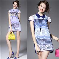 2015夏季女装新款欧美翻领短袖真丝印花绣花镂空修身A字裙