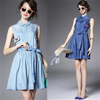 2015夏季新款俏皮翻领眼睛刺绣口袋拼接纯色牛仔连衣裙系带修身