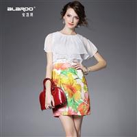 2015夏季女装欧洲时尚圆领短袖绣花拼接气质印花修身连衣裙
