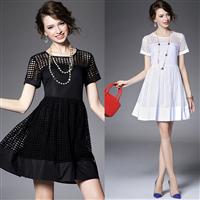 2015夏季新款女装 欧美大牌圆领短袖纯色方格镂空绣花修身连衣裙