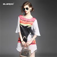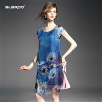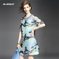 2015品质女装夏季新款 圆领真丝印花气质不规则修身连衣裙送吊带