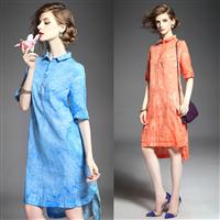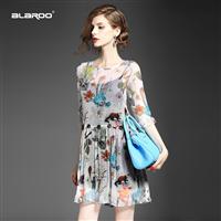 2015欧美品牌女装夏季新款 圆领喇叭袖纯麻印花宽松气质连衣裙