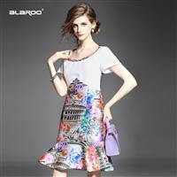 2015夏新品圆领钉钻后背蕾丝拼接印花大摆鱼尾裙连衣裙