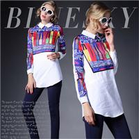 2015新款纯棉打底印花白衬衣女中长款宽松全棉长袖白色衬衫