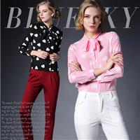 2015春装新款欧美风修身桃心印花真丝衬衣女式长袖衬衫