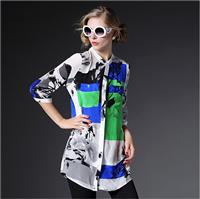 2015春夏新款真丝雪纺衫桑蚕丝印花七分袖长款真丝上衣衬衣
